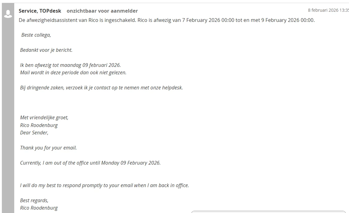 Voorheen gebeurde het bij ons dat wanneer een behandelaar een melding op Wacht op aanmelder zette terwijl de aanmelder afwezig was, de status direct weer veranderde naar Reactie ontvangen. Dit kwam doordat het automatisch antwoord-mailtje werd geïmporteerd en TOPdesk dit als een reactie interpreteerde. We importeerden automatisch mailtjes om te kunnen bepalen of een aanmelder aanwezig is.
