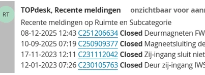 Als behandelaar werk je aan een melding en wil je snel volledig inzicht krijgen in wat er eerder in dezelfde ruimte is gemeld. Denk hierbij aan de laatste tien meldingen die betrekking hebben op dezelfde ruimte én dezelfde subcategorie — bijvoorbeeld terugkerende klachten over klimaat, verlichting, schoonmaak, meubilair of technische voorzieningen.