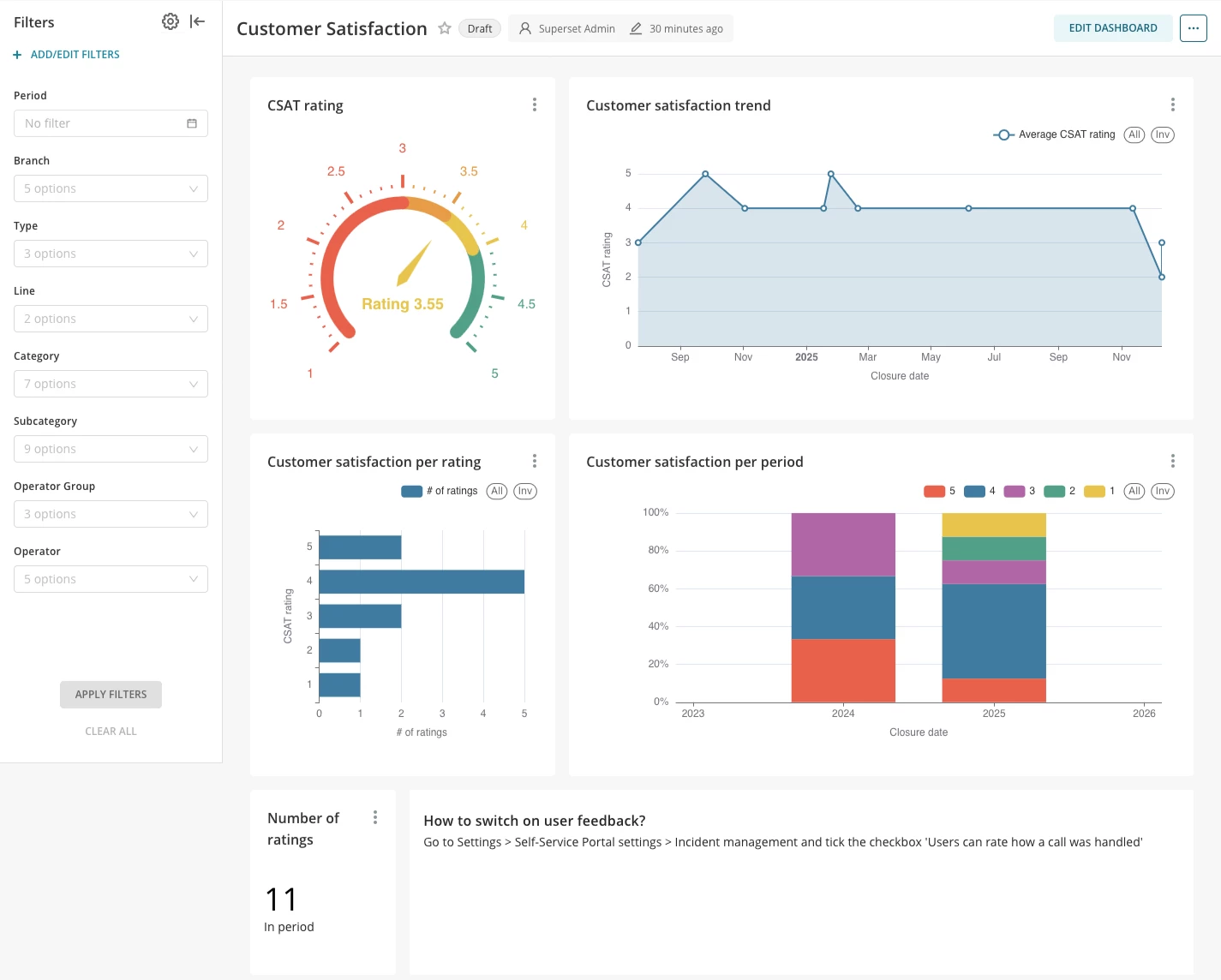 The CSAT Dashboard supports your continuous improvement efforts by showing: