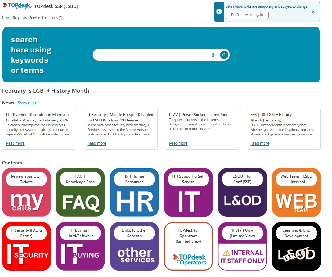 Curious about the future of the end user experience? Make sure you're not logged in to the Operator section, and simply add ‘/services/navigation-frontend/ssp/home’ behind your environment’s URL, e.g. ‘mycompany.topdesk.net/services/navigation-frontend/ssp/home’. And feel free to share this beta with your end users. Their feedback is invaluable for creating an end product that actually works for you.