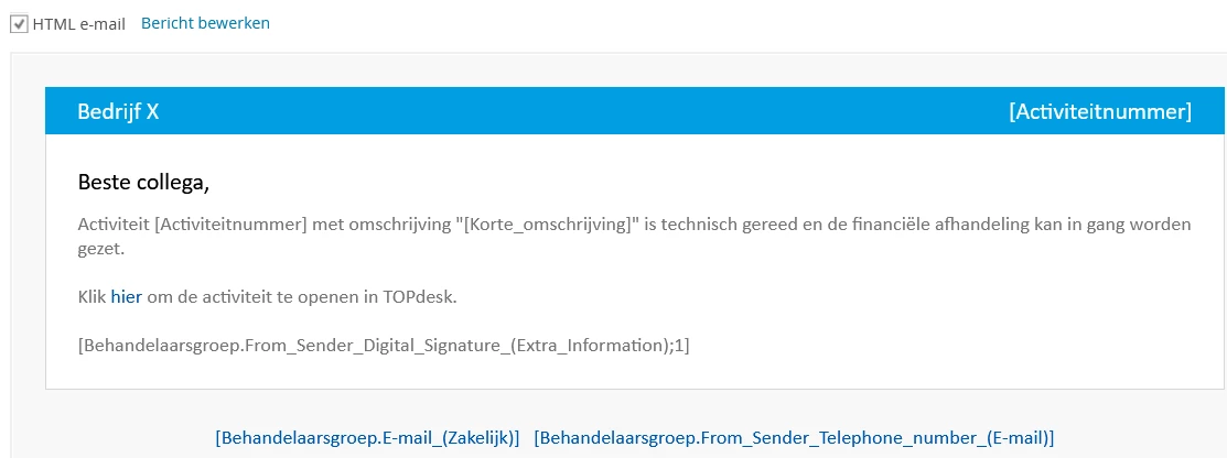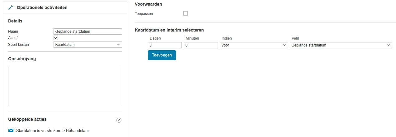 Wij zijn begonnen met de inrichting van Operationeel beheer. Nu loop ik er tegen aan dat ik gewoon weg niet weet hoe ik een email actie kan maken dat een afdeling een mailtje krijgt op de signaleringsdatum. Ik hoop dat iemand een voorbeeld voor mij heeft. Het gaat dus over een actie en een gebeurtenis
